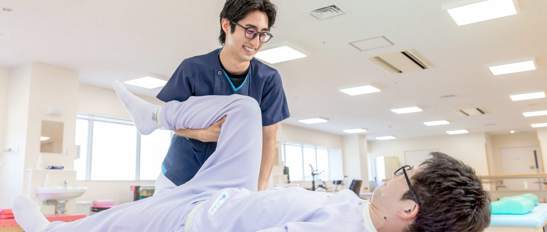 理学療法部門では呼吸器疾患、神経難病、脳血管障害、重症心身障害児(者)、糖尿病などの患者さまに対して、立ち上がって歩くなどの基本動作訓練や呼吸リハビリ、また痛みなどに対し快適な療養を行えるようコンディショニングを行っています。また医療機器が充実しており、部分免荷歩行装置、重心動揺計を備えています。