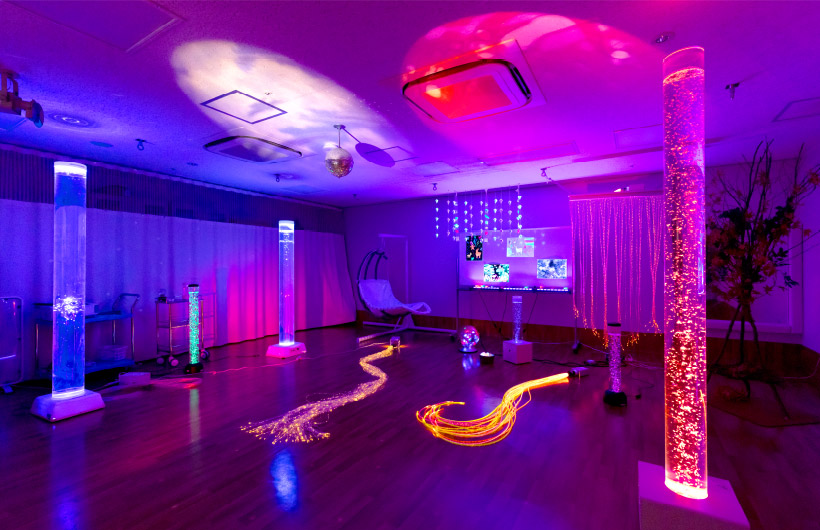 当院では、保育士や児童指導員が中心となり、重症心身障害の患者様を中心に実践しています。穏やかな表情でウトウトされる方、光をじっと見つめる方、機嫌のよい声をあげながらランプを触る方、患者様お一人お一人の感じ方、受けとめ方で楽しまれています。